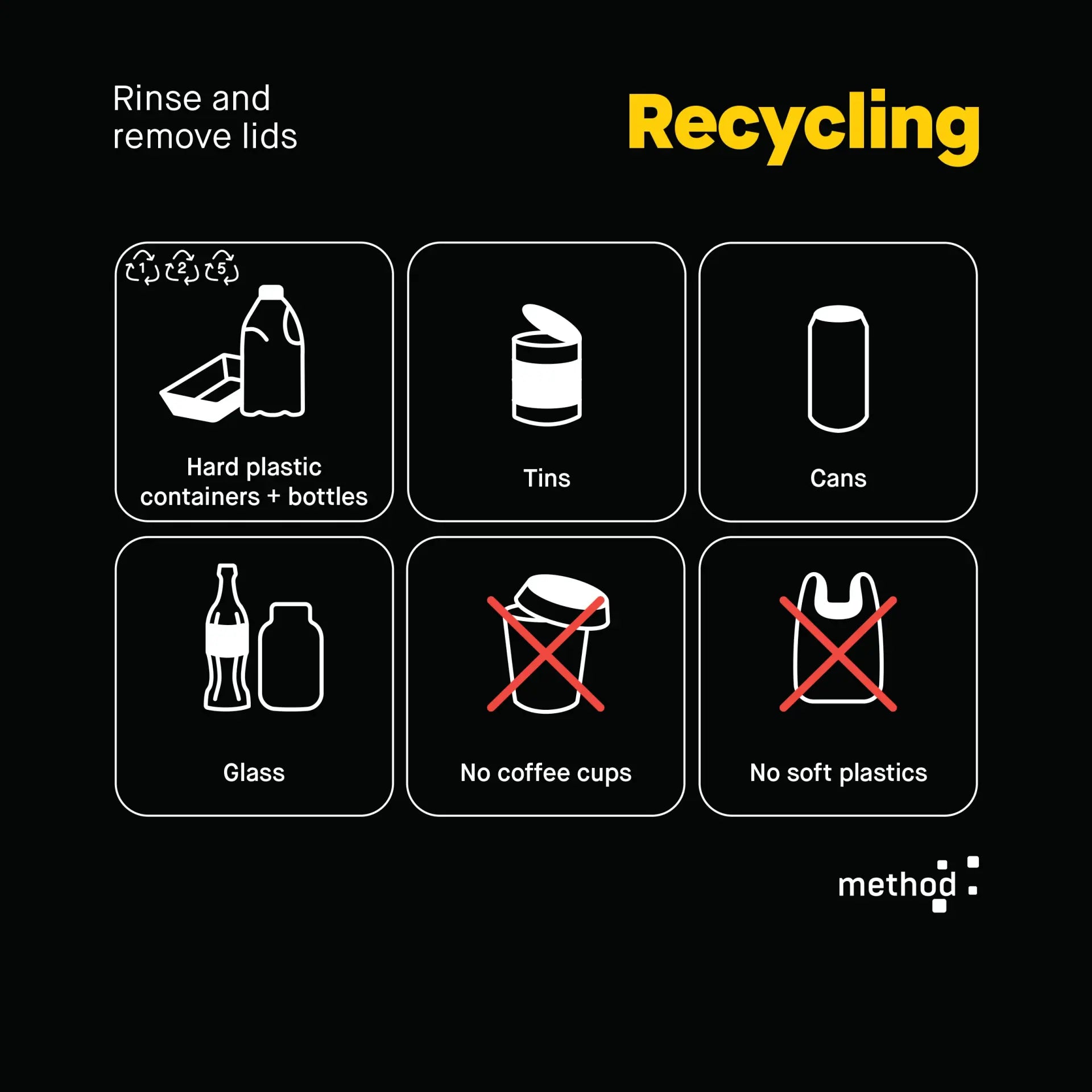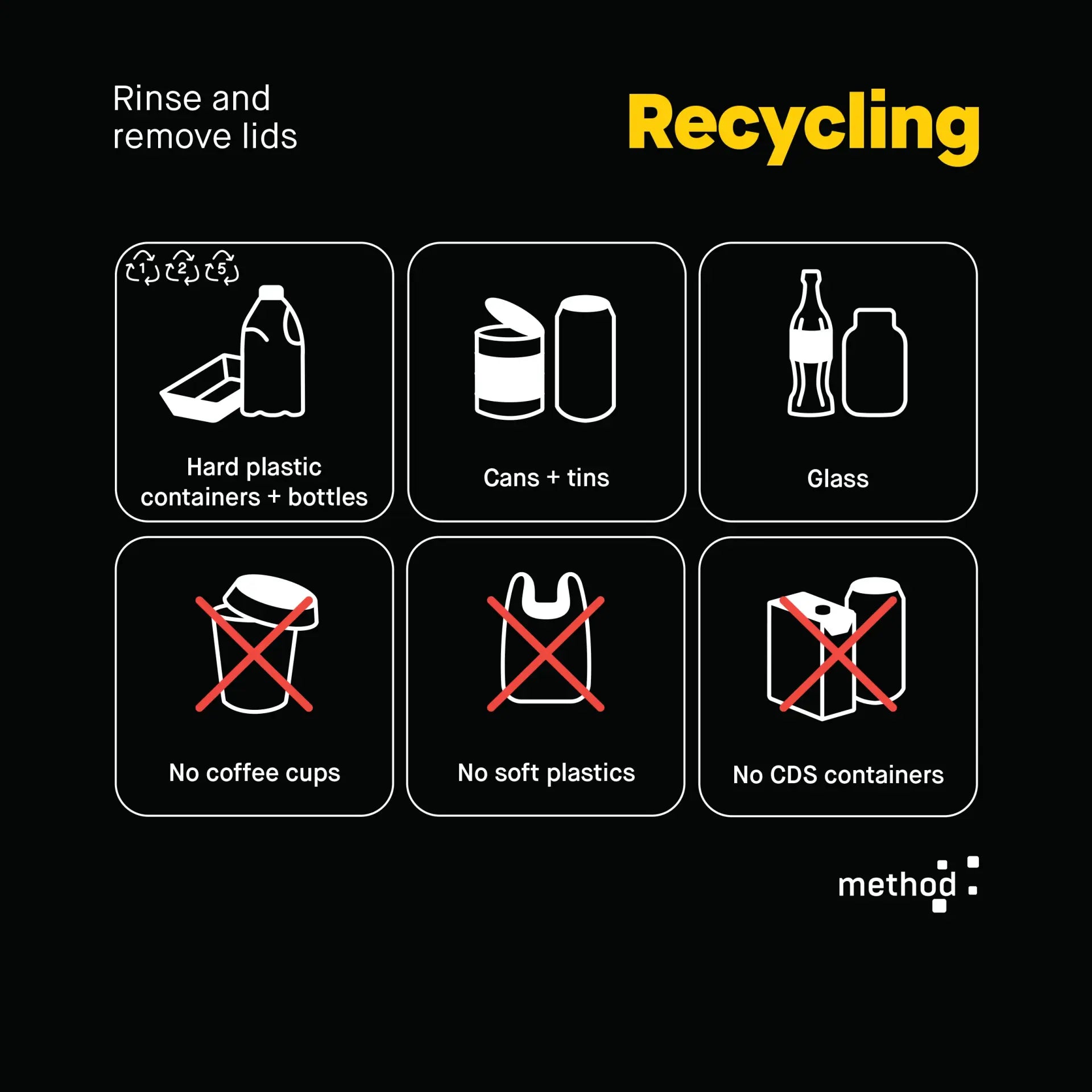 The ultimate in recycling education, reduce waste to landfill and contamination with Method Vertical Signage. It stands proudly above your beautiful bins to help users accurately separate their waste. Attached to the bins with Method's heavy-duty connectors vertical signage is sturdy, durable and an effective way to reduce contamination.